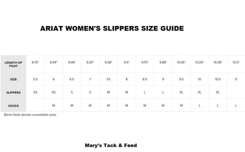 Warm winter slippers for women have a distinctive decorative mudguard between outer sole and upper and an Ariat logo on the top. Ariat Snuggle Slippers in Appaloosa or Tan make a great gift for anyone. Be sure to treat yourself to a pair, too! Size guide is in product photos.