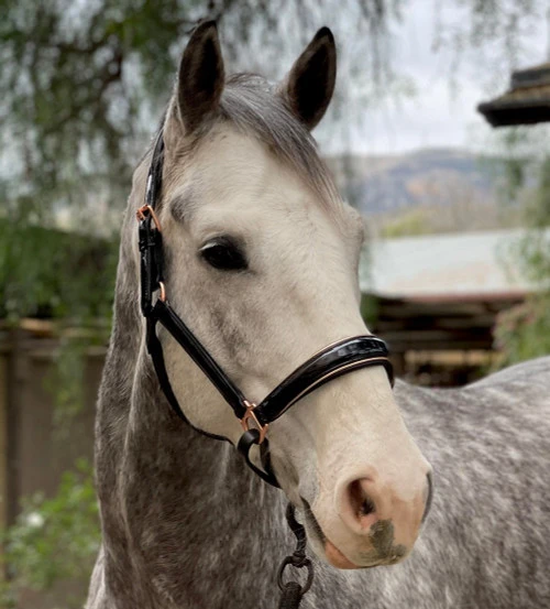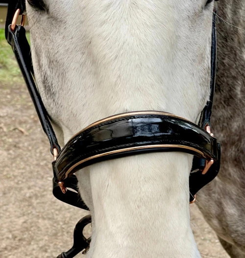Halter Ego Aurelia Rose Gold Halter makes a statement in black patent leather with rose gold fittings and glittery metallic rose gold piping. Yes, yes, yes! Super soft Nappa leather padding under the noseband and crownpiece add plush comfort while framing the beauty of the patent leather. Halter Ego Aurelia Rose Gold Halter matches the Aurelia Rose Gold Snaffle Bridle, just in case you are someone that needs this important information!