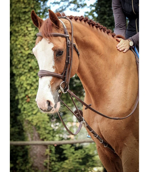 The Jump’in Patrick Training Aid for horses can be used for lunging or riding to reinforce proper stretching and muscle development. The leather attachment system will fit both standard and wide bridle crown pieces. There are plenty of adjustments to get the correct fit. The Patrick Training Aid works very well for young horses and as a refresher or retraining older horses. It is gentle enough for use by less experienced riders, with supervision.