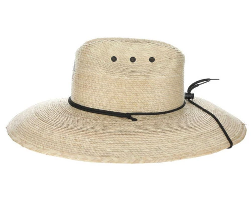 Dorfman Overcast Lifeguard Hat offers ample coverage all around. The chin cord with plastic adjuster helps keep it in place and the pinched crown with metal eyelets allows air circulation for a cooler head. The soft elasticized sweatband is comfortable and ensures a good fit. The palm leaf Dorfman Overcast Lifeguard Hat for men is naturally water resistant as well as UV protective. The Natural color sun hat is finished with a brown braided rope hat band and chin cord.