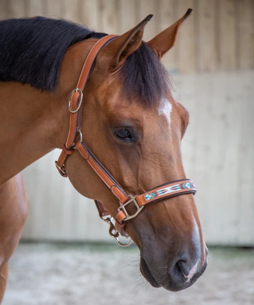Pénélope Pearl Halter is a stunning leather horse halter with intricately patterned beaded inlay on the noseband. Lovely and sturdy, it is lined with soft full grain leather for a smooth, comfortable feel on your horse’s face and poll. The Pénélope Pearl Halter is available in Black or Cognac leather with unique bead colors and patterns.