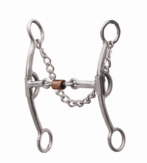 The Derby 3-Piece Smooth Shank Bit from Professional’s Choice is designed for a finished horse who enjoys a softer feel on the bars and the entertainment of a copper roller. Western shank bit has a smooth dog bone with a copper roller and lies comfortably across the tongue.
