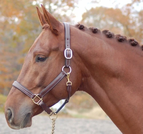 Red Barn Lainie Halter is a handsome leather horse halter with nice details and sturdy construction. KL Select’s line of Red Barn Halters feature soft, supple English leather and the finest detailed workmanship, combining strength with elegance. The Red Barn Lainie Halter is a triple stitch halter in brown with white stitching, accented with brass buckles.