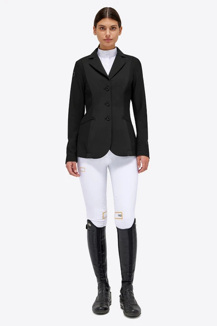 Women’s RG Jersey and Mesh Riding Jacket in versatile black was created with the goal of show ring comfort, classic style, and a contemporary edge. The Rider’s Gene RG Mesh Jacket is a traditional three button coat with with a smooth jersey front and technical mesh sides, sleeves, and back. The RG line is produced by Cavalleria Toscana.